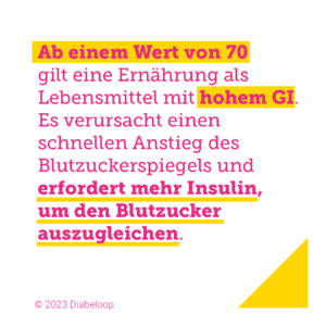 Ab einem Wert von 70 gilt eine Ernährung als Lebensmittel mit hohem Glykämischen Index. Es verursacht einen schnellen Anstieg des Blutzuckerspiegels und erfordert mehr Insulin, um den Blutzucker auszugleichen.