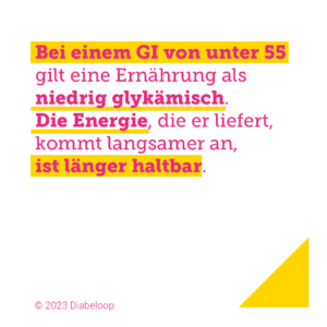 Bei einem glykämischen Index von unter 55 gilt eine Ernährung als niedrig glykämisch. Der Zucker aus einer Ernährung mit einem niedrigen Glykämischen Index gelangt langsamer in den Blutkreislauf. Die Energie, die er liefert, kommt langsamer an, ist aber länger haltbar.